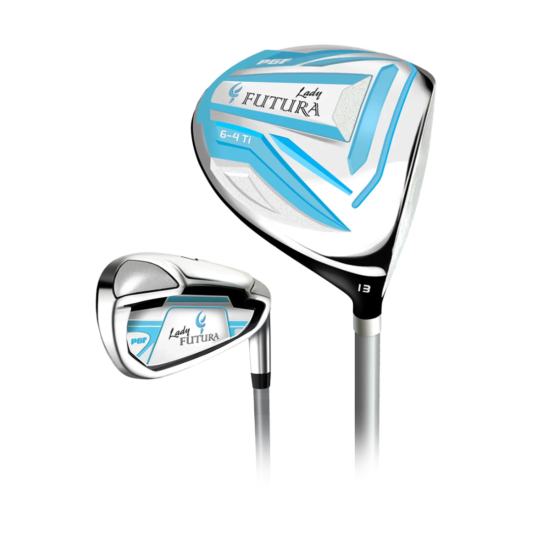 The PGF Lady Futura package has been meticulously crafted to cater to the needs of female golfers. This comprehensive set includes a 13⁰ 460cc 6-4 Titanium driver, a stainless #3 Fairway wood, and 22⁰ and 26⁰ Hybrid clubs. The irons are designed with offset face settings and a low, deep center of gravity (CG) to help players launch the ball high and straight with ease. Additionally, the Lady Futura putter is specifically engineered to enhance balance when putting. To complement the clubs, the Lady Futura package also features a new cart bag, packed with features & matching head covers for all woods, hybrids and putter. Available 2 colours, ladies right and left hand.