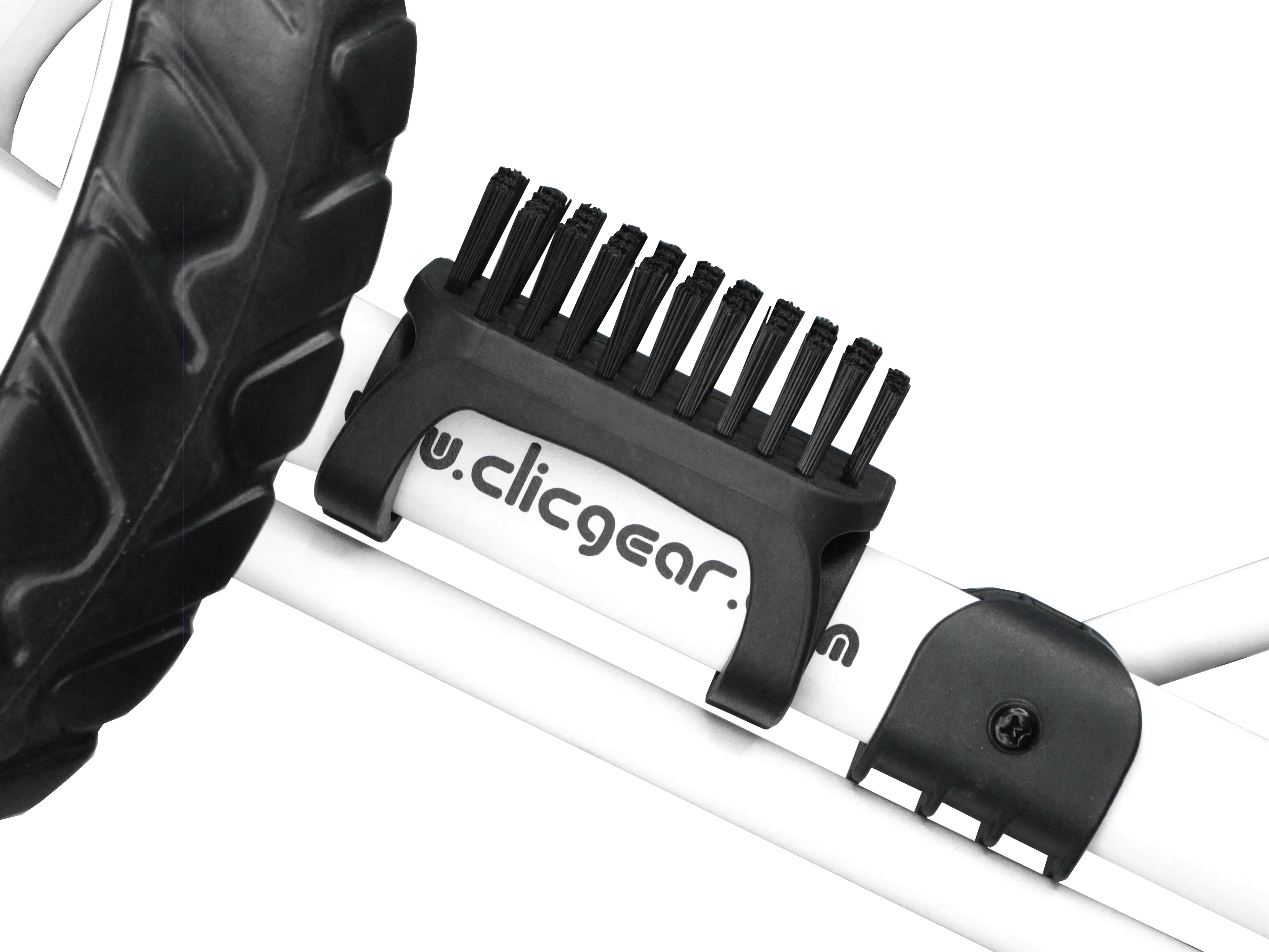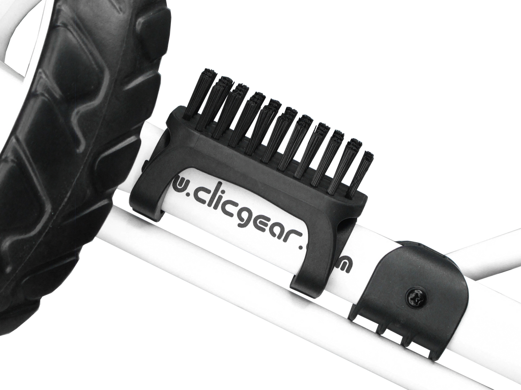 The Clicgear® Shoe Brush clips on easily to the standard wheel strut for easy shoe cleaning. Heavy nylon reinforced plastic, with sturdy bristles for cleaning cleats or clubs. Can be attached to both the left and right hand rear wheel struts.