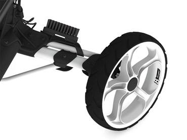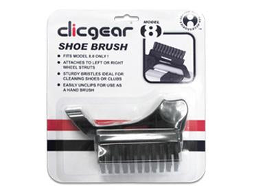 The Clicgear® Model 8.0 Shoe Brush installs easily standard wheel strut for easy shoe cleaning. Heavy nylon reinforced plastic, with sturdy bristles for cleaning cleats or clubs. Can be attached to both the left and right hand rear wheel struts.
