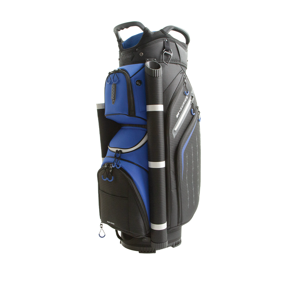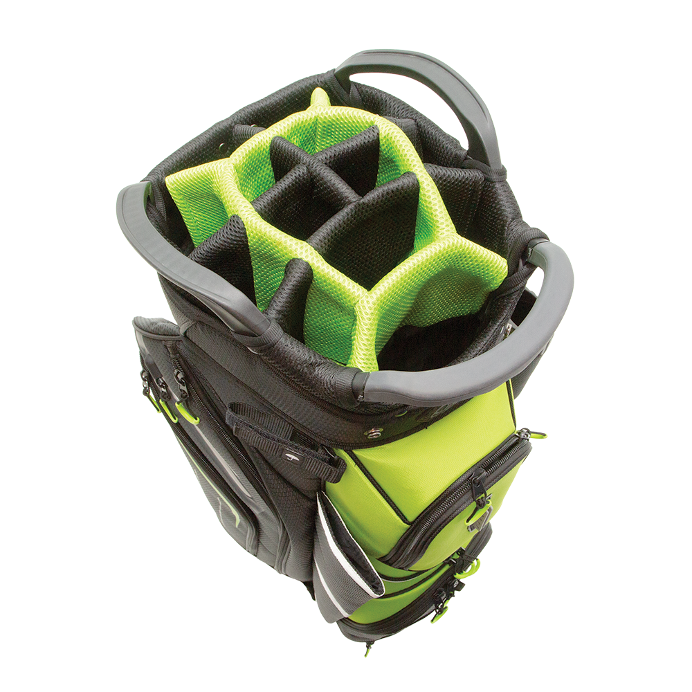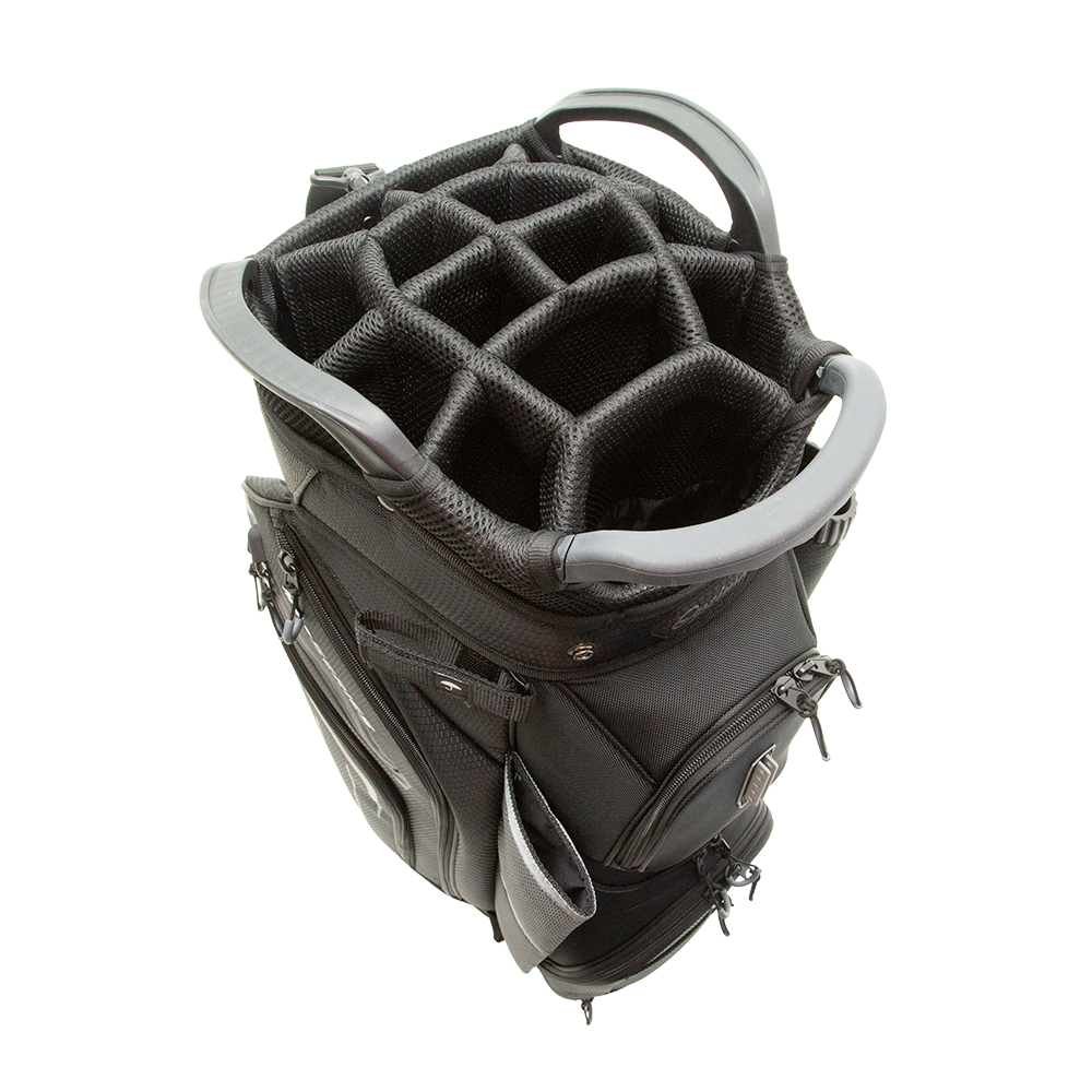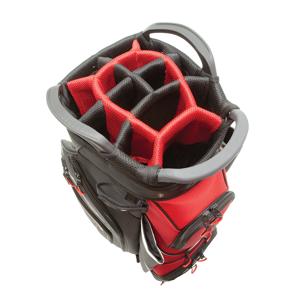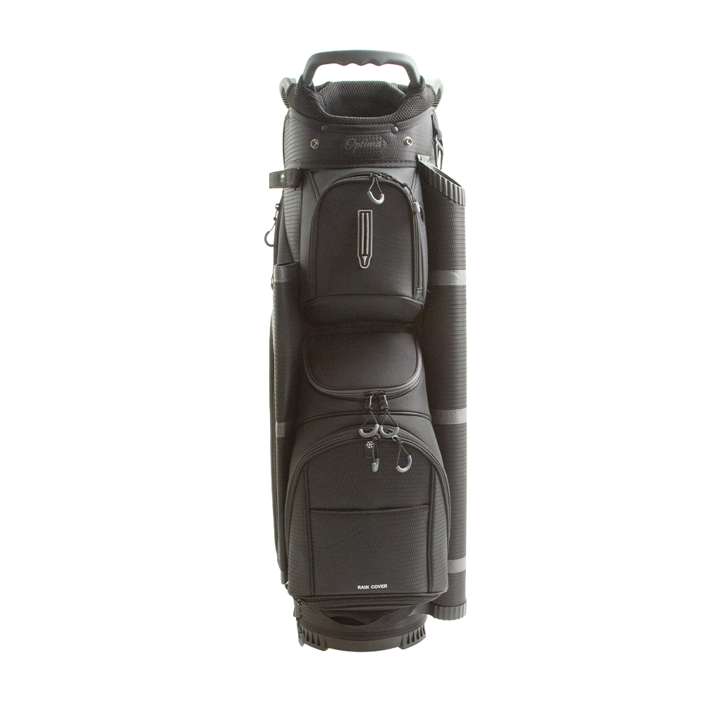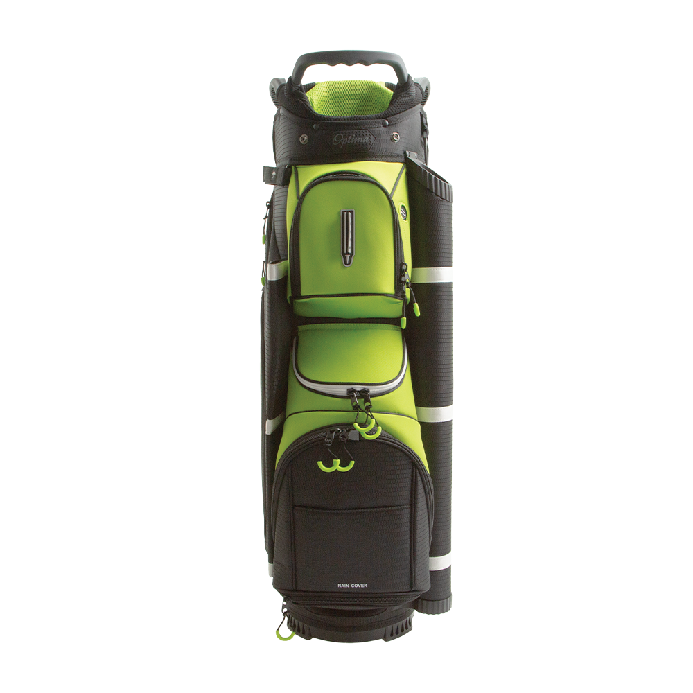 The Optima Champion bag features premium fabrics and lightweight stay construction. The Champion boasts the features that make it one of the most popular cart bags such as 14-way top with full length dividers, external putter pit, umbrella sheath and full-size rain coverall. With 9 high-volume pockets, there is vast space for all your equipment and accessories like the cooler pocket with drainage eyelets, dry pocket and the waterproof valuables pocket. It also features dual easy-lift grab handles for easy manoeuvrability.