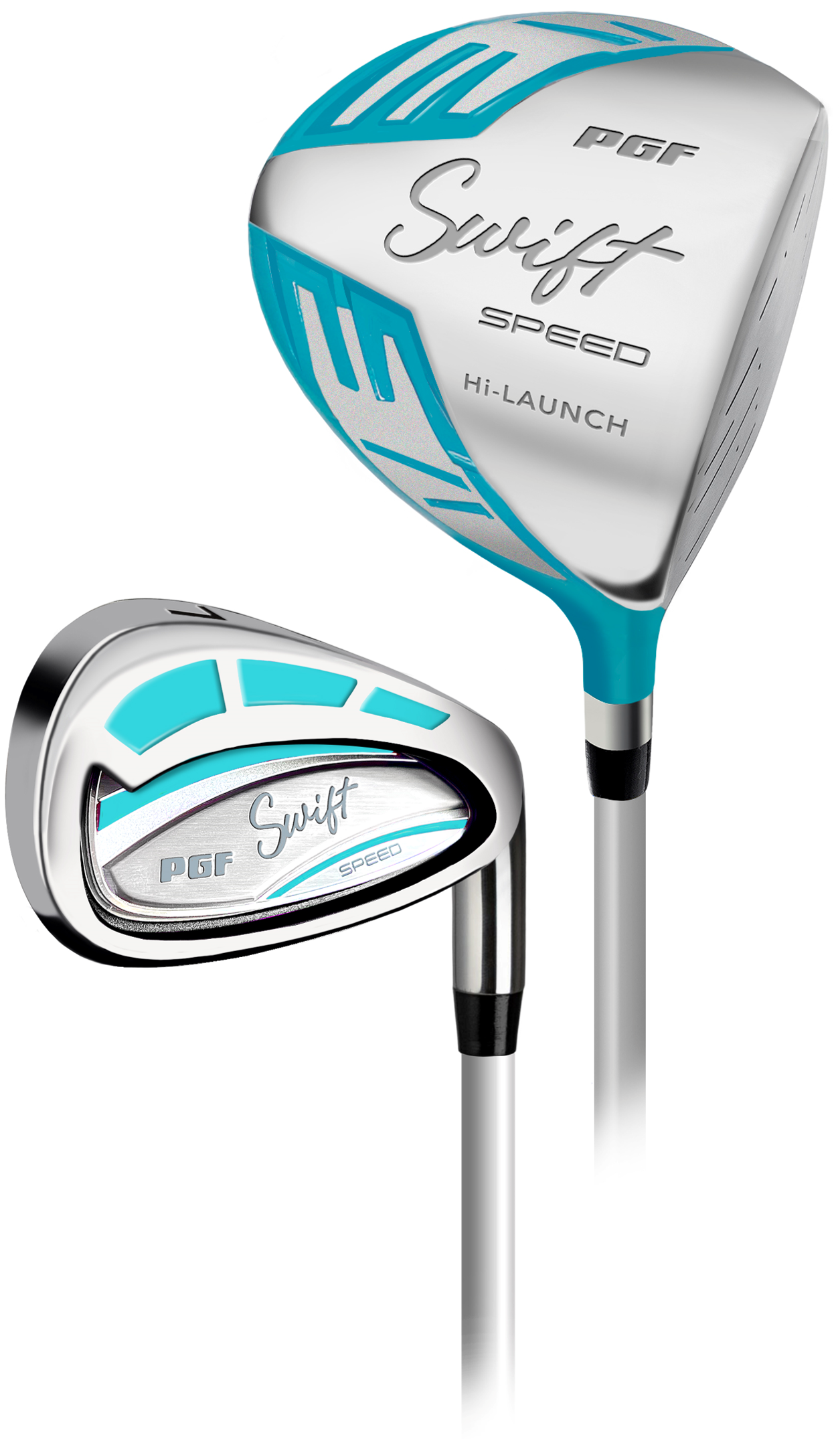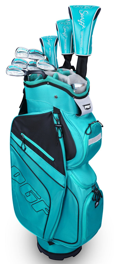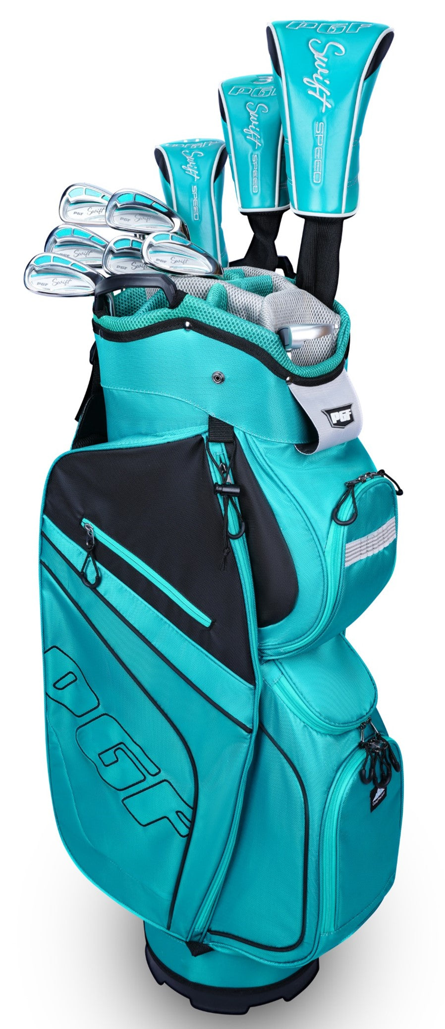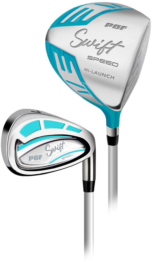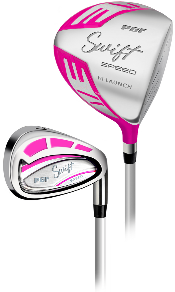 Stand out on the fairway with the ladies PGF Swift Package, which provides all the essentials for new players to confidently start playing the game. This package includes a 460cc oversized 13⁰ Driver, high launching stainless steel Fairway & Hybrid clubs, oversized stainless irons from #6-SW, and a mallet style putter with alignment aide for improved performance on the greens. Everything comes neatly packaged in a quality 9" cart bag with a 14-way top and matching headcovers.